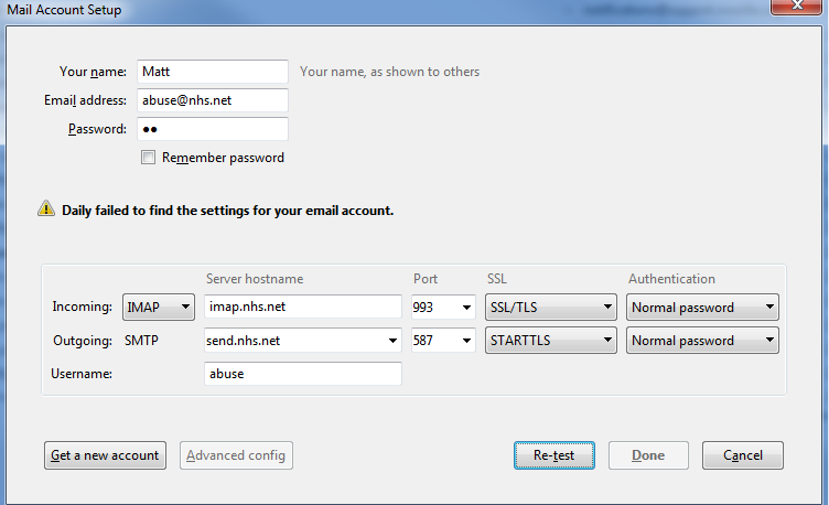 Really appreciate your help, but now it is coming up with the following even though I know the username and password are correct because I can login with them online (see the error message attached)!. Assuming that the username =email minus the @nhs.net. Also, in the guidance it states to select TLS for SMTP and I'm selecting STARTTLS as you suggested in order to get the 587 port - is that the same as TLS - why is this so difficult!?