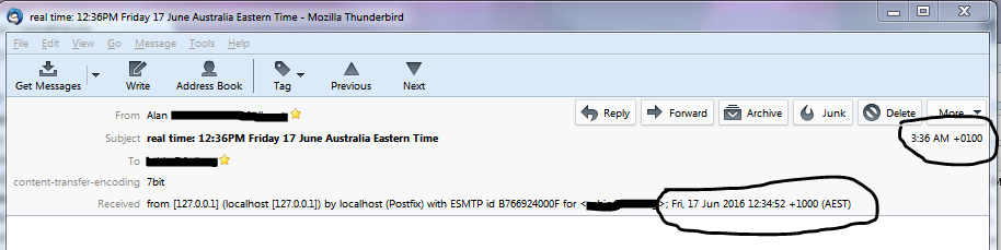 I am running a Windows 7 OS with version 45.1.1 of Thunderbird. For the last few years I have had an incredibly annoying problem with the way the date/timestamp of an email is displayed in the message header and Inbox/mailbox view. This has gone on for a long time, as mentioned, and each time I've tried to fix it I've just given up and lived with the problem. I'm trying again. Part of the issue might be related to the complex mail routing issues involved. I am using an SSH tunnel to connect to an IMAP server in Canada, but I am receiving the mail in Australia. I think the time being displayed is from North America. I have seen the odd support query about timezone settings and the general response is to check the timezone setting on the local machine. I have done this. It is set correctly. I cannot find anywhere in the settings where it may be entered in conflict. This is my current setting: "(UTC+10:00) Brisbane". I have attached an image of a message I sent to myself to illustrate the problem. This image is of the mail header when I open a message. In the upper right corner is the incorrect time that is shown in the Date and Received columns in my Inbox. I have also circled the time in the Received line of the mail header itself. This time is accurate, but it is not the one that is used to display in my list of message in my mail folder. This timezone error is also effecting the calendar functions. I only just noticed this a week or so ago, as I do not generally use the calendar. It was showing yesterday's date as today's date when I was looking at the interface during my morning (which would have been the previous date in North America). This kind of error would make using the calendar problematic if I ever wanted to get full use of the software.