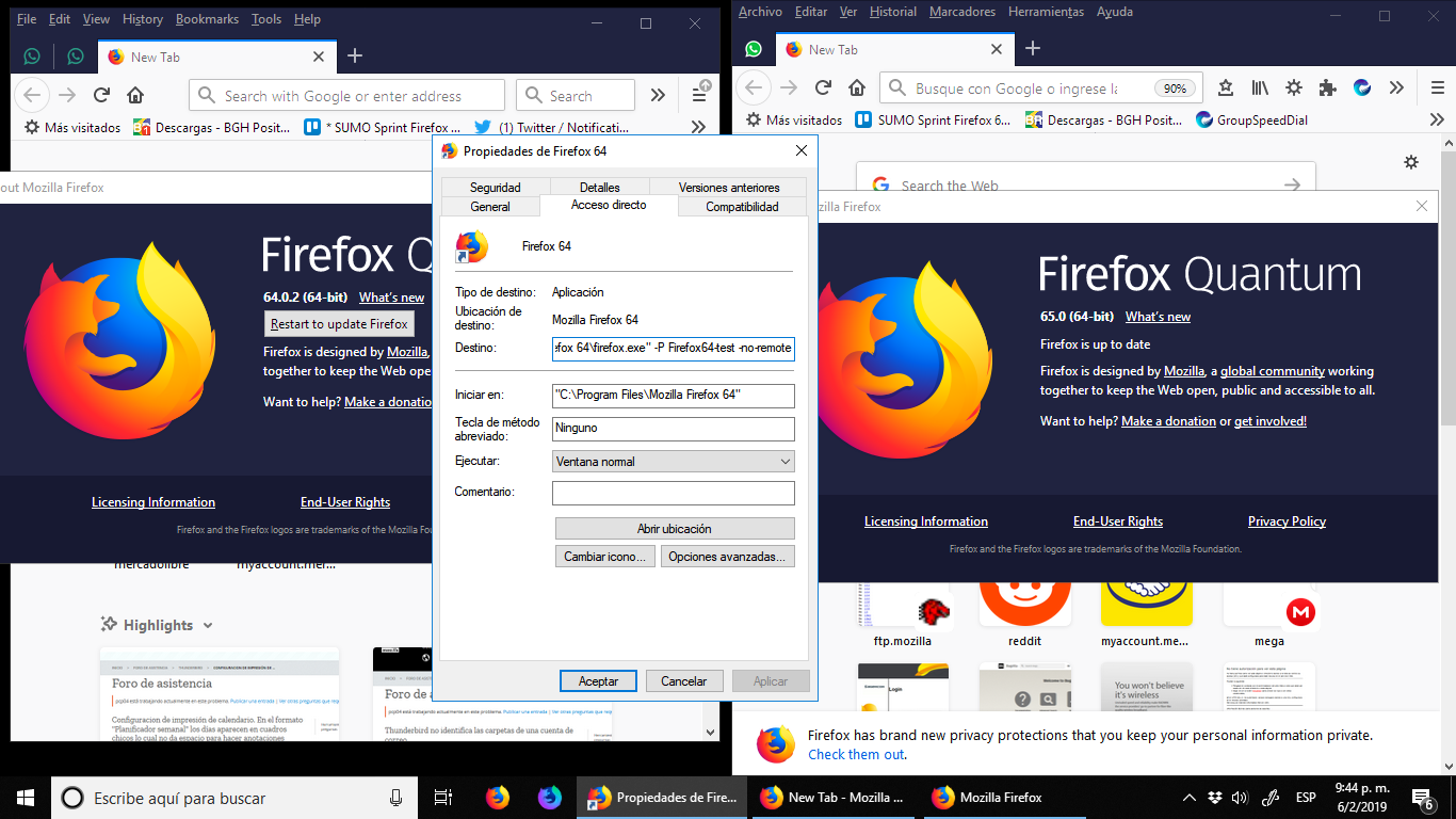 Hola, Yo tengo varias versiones de Firefox pero las abro de una a la vez, dejame probar como es el tema para abrirlas simultáneamente, mientras tanto crea un perfil nuevo para el Firefox 10 (o para el Firefox 65 si es que este aun lo instalaste) y haz referencia a ese perfil en el acceso directo que utilizaras para ejecutar este Firefox. La idea es que cada Firefox corra en un perfil de Firefox diferente. Usar el Administrador de perfiles para crear y eliminar perfiles de Firefox: http://mzl.la/1BAQGnB La siguiente guía indica como crear un acceso directo para abrir un perfil determinado, no hace falta seguirlo tal cual, la idea es modificar el acceso directo para levantar un perfil determinado https://support.mozilla.org/es/kb/utilizar-un-perfil-especifico-para-firefox-beta Saludos