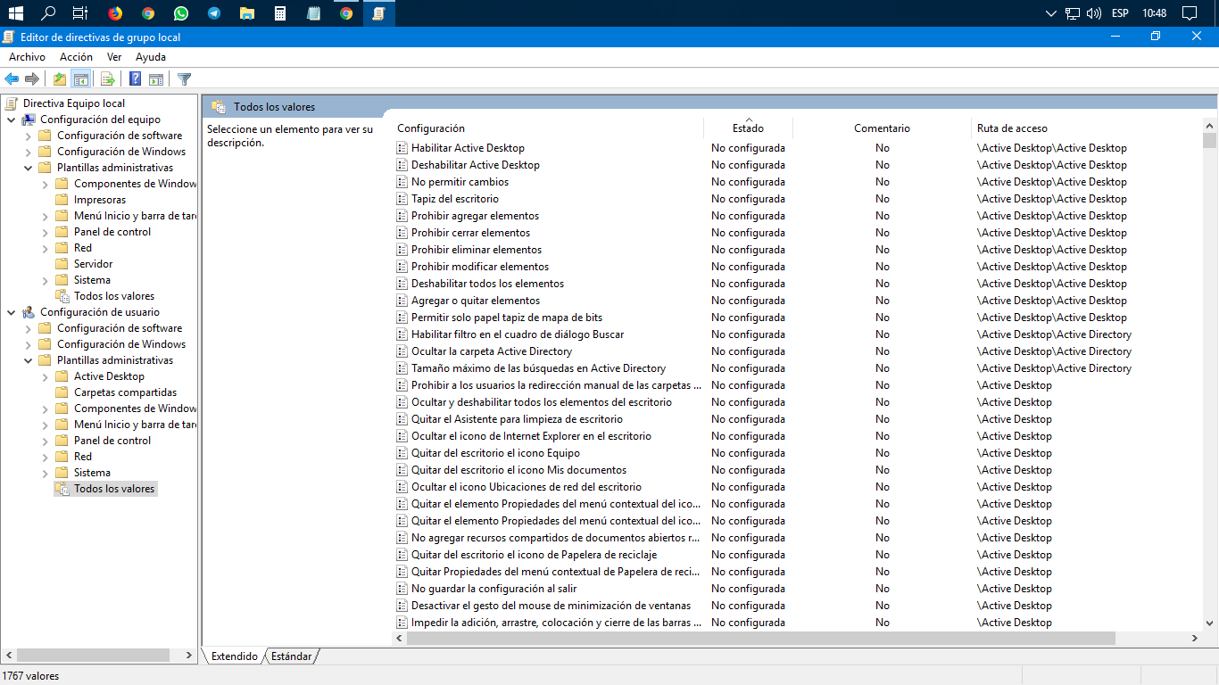 Revisé ambas locaciones, tanto el grupo de políticas dentro del computador en general como las políticas en el usuario y ordenándolas por Estado (como bien dice el artículo) TODAS aparecen en "No Configurado", así que, tal parece que el misterio sigue.