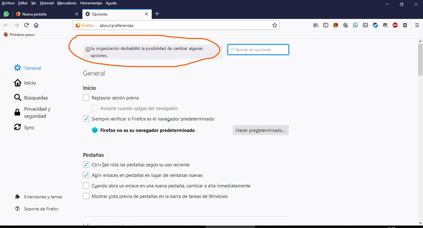 Mensaje: su organización ha deshabilitado la posibilidad de cambiar algunas opciones