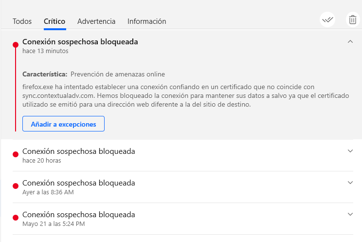 Buenos días: Desde hace unas semanas mi anti virus me indica que la Firefox está intentando conectar con sync.contextualadv.com, una url sospechosa por temas de su certificado. ¿Qué debo hacer? Gracias