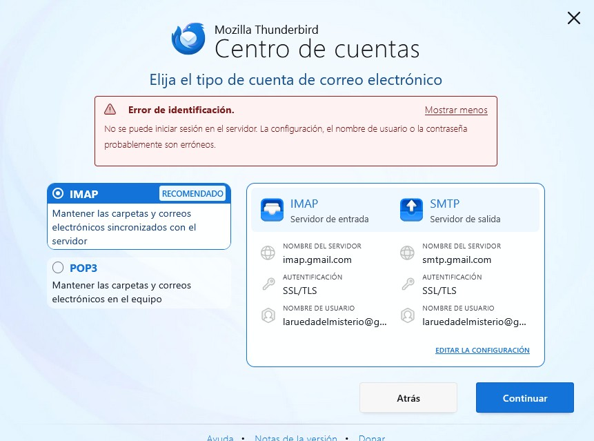 A pesar de llevar años con un correo de gmail, ahora me dice lo que os pongo el la imagen. He creado un nuevo correo, y me dice lo mismo. Si intento iniciar sesión me dice lo mismo y si hago lo que me indica de eliminar datos de navegación, etc.... de nuevo en bucle. Por cierto, el Thunderbird está completamente actualizado y los demás correos funcionan bien. Alguien sabe como solucionarlo?