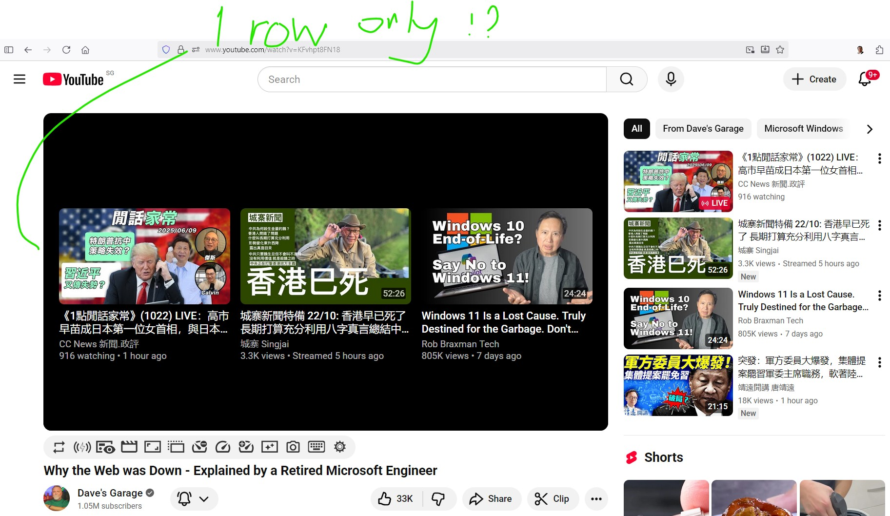 The layout of YouTube was different from before. In the past, after the YouTube video was over. The MAIN WINDOW within YouTube page would showed two rows of recommendations. Now there is only one row with great amount of black-out space at top and bottom. Any suggestion to tune it to the usual two rows?