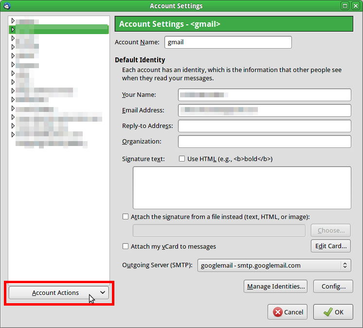 Your screen shots show exactly what zenos has told you to do. but you seem to be ignoring the information. You have selected the account in the left pane - this is correct. Then, according to the image, you clicked on 'Manage Identities' button to show that small pop up window. At no point was this suggested.