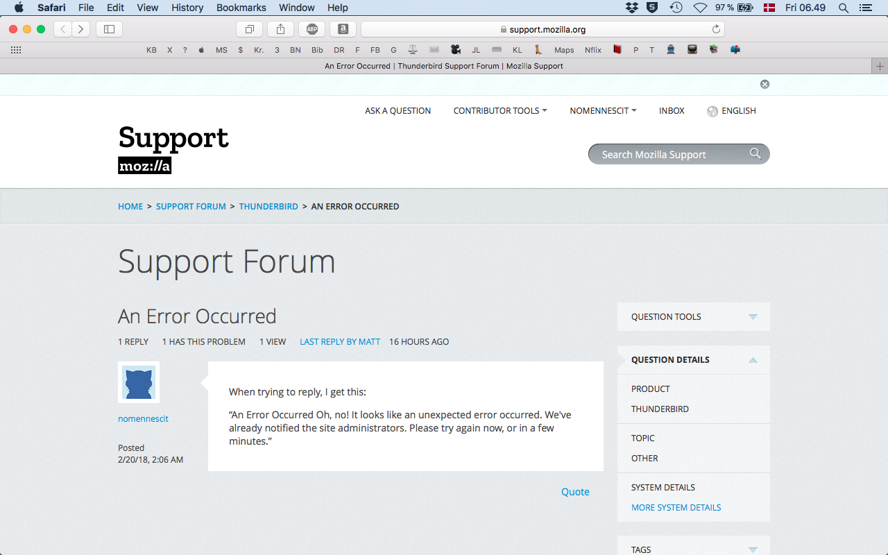 Did you mean to send that particular picture? That's Safari, not Thunderbird, and there is no error message.