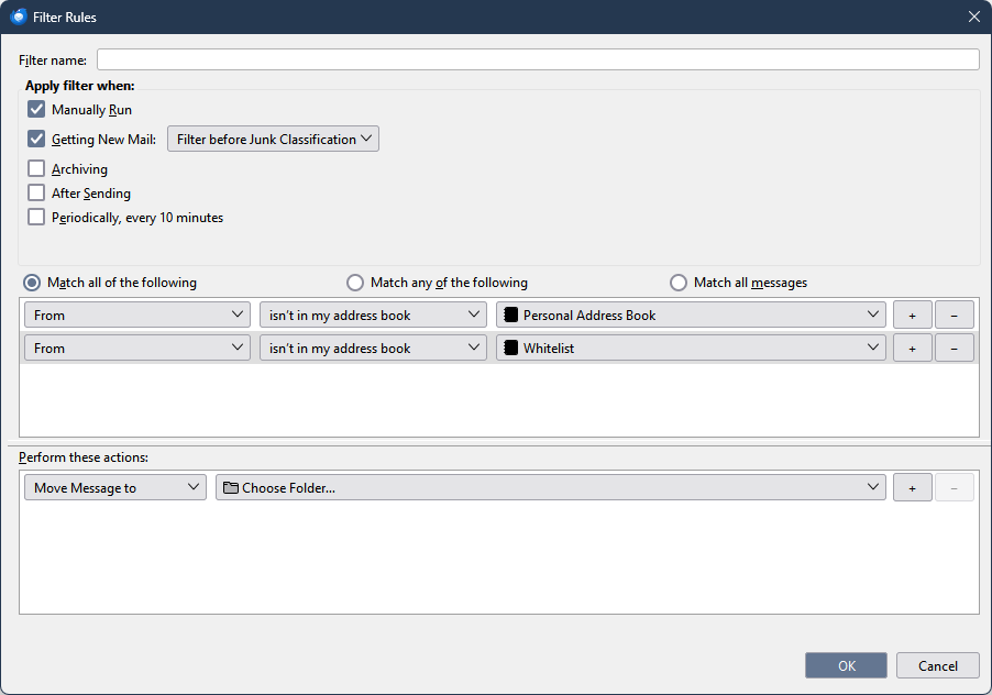 I've set up filters to eliminate all the spam I get, using a White list and a Black list. While that mostly worked, I wanted a better idea. So I got rid of the blacklist, and just have a White list. If any email address isn't in the White list, I want the email to be automatically transferred to the Junk emal folder.