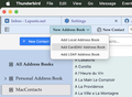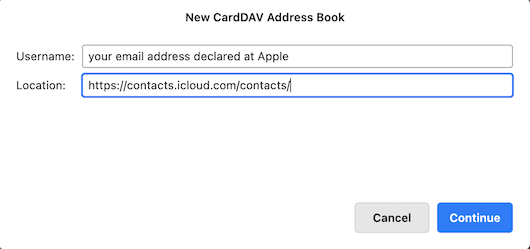 If you have activated iCloud and the two factor authentication for TB on your Mac you may create a CardDav address book to synchronise your macOS "Contacts" with TB. In the Address Book tab toolbar click on "New Address Book" and choose "Add CardDav Address Book" (image 1) This opens a new address book wizard (image 2): As "Username" fill in the email address which you have declared for your Apple account. In the second line "Location" fill in the following URL https://contacts.icloud.com/contacts/