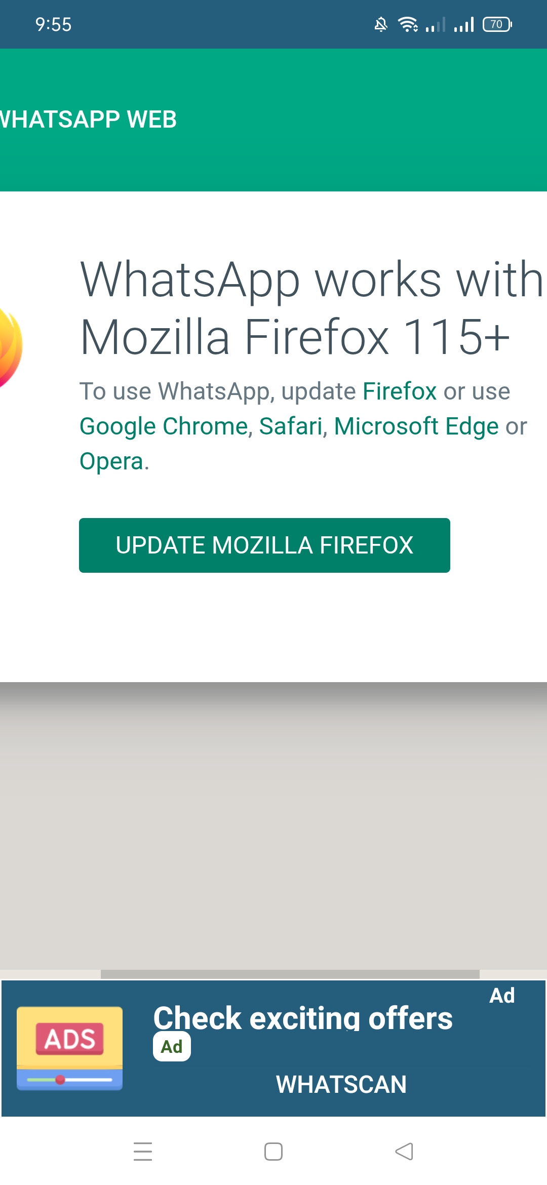 If this is with Firefox on your phone then this likely means your Firefox version is too old as the web whatsapp site wants users to have Firefox 115 or later.