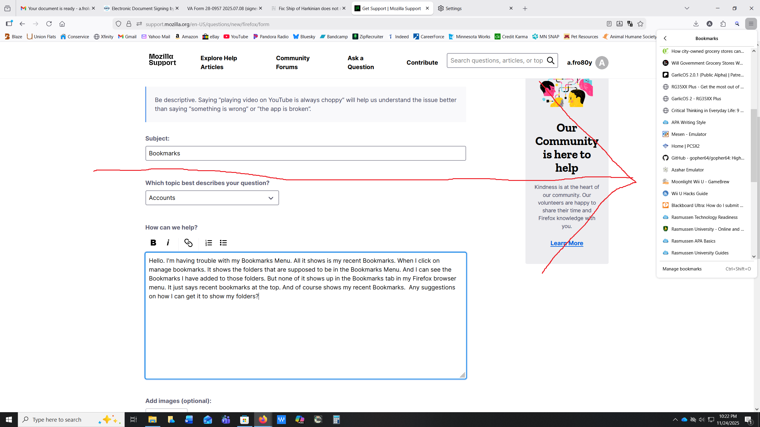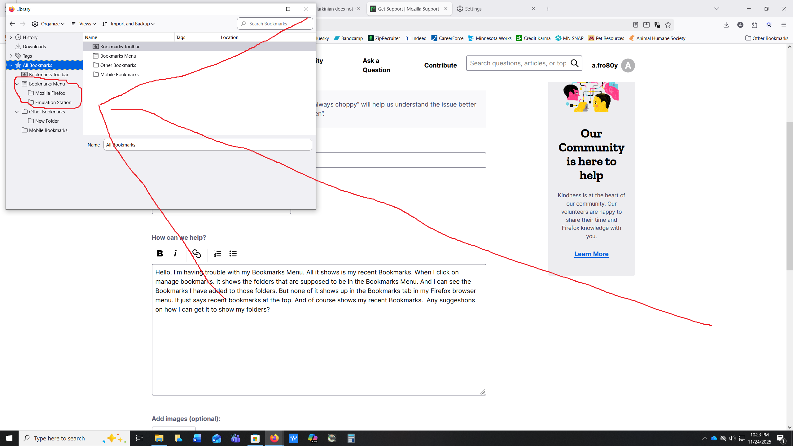 Hello. I'm having trouble with my Bookmarks Menu. All it shows is my recent Bookmarks. When I click on manage bookmarks. It shows the folders that are supposed to be in the Bookmarks Menu. And I can see the Bookmarks I have added to those folders. But none of it shows up in the Bookmarks tab in my Firefox browser menu. It just says recent bookmarks at the top. And of course shows my recent Bookmarks. Any suggestions on how I can get it to show my folders?