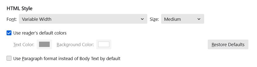 Further, from the article I gave you, Thunderbird does NOT include font size in emails unless you force large or extra large or small. The font size you see on screen is for you. If sent without font size - or as plain text - the recipient's email client sets the size. That is why I recommend setting the HTML composition font to variable width, as that frees the recipient to see the font in his/her chosen font and font size.