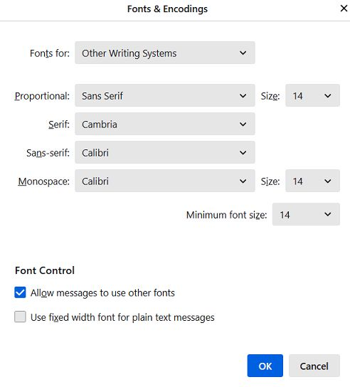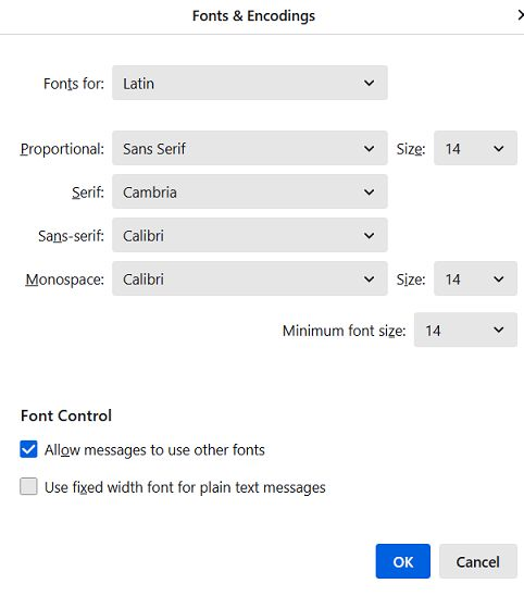 Thunderbird has a rich variety of font settings. I believe they are documented in this link. The options you are referencing are not the best choice.