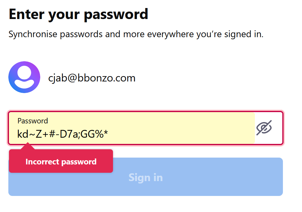 Andd checking the the Bookmarks tick-box was checked [as was last attempt] I tried to sign in to open the required page, but got 2 x 'error' windows, as attached, one for enail address [been using this for 2 yaers] and the other for password [how did I get this page up with the wrong password??]