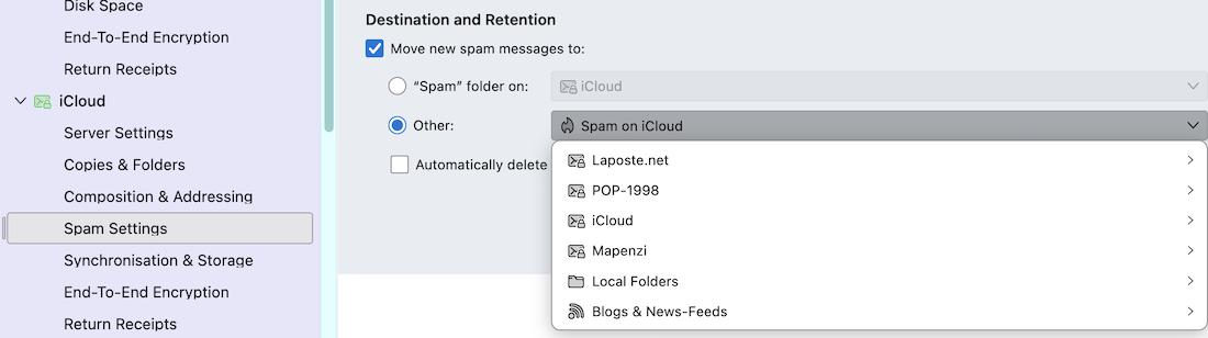 Further, under "Accounts\Spam Settings\" there is a "Destination and Retention" section. There is no "Junk" folder available under "Other".