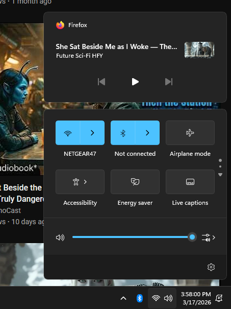I see a youtube video ready to play when I open my wifi icon on the taskbar. Only happens when Firefox has Youtube open in a tab and I've watched at least one video in preview mode or on the video page. I really wish to turn it off if I can.