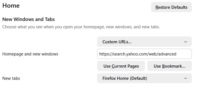 After upgrading to 149.0.2 (64-bit), when starting FF or opening an new tab, the preferred URL is not loaded. It is configured in Settings/Home/New Windows and Tabs All previuos FF versions were OK with the same URl (https://search.yahoo.com/web/advanced)