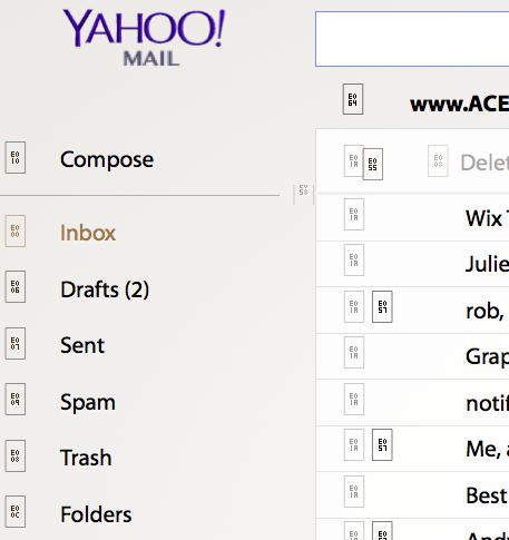 Thank you for the screen shot. Yahoo recently changed some of its icons to characters in a custom font set instead of images. When that font isn't loaded or is corrupted, you get the box with two rows of two characters.