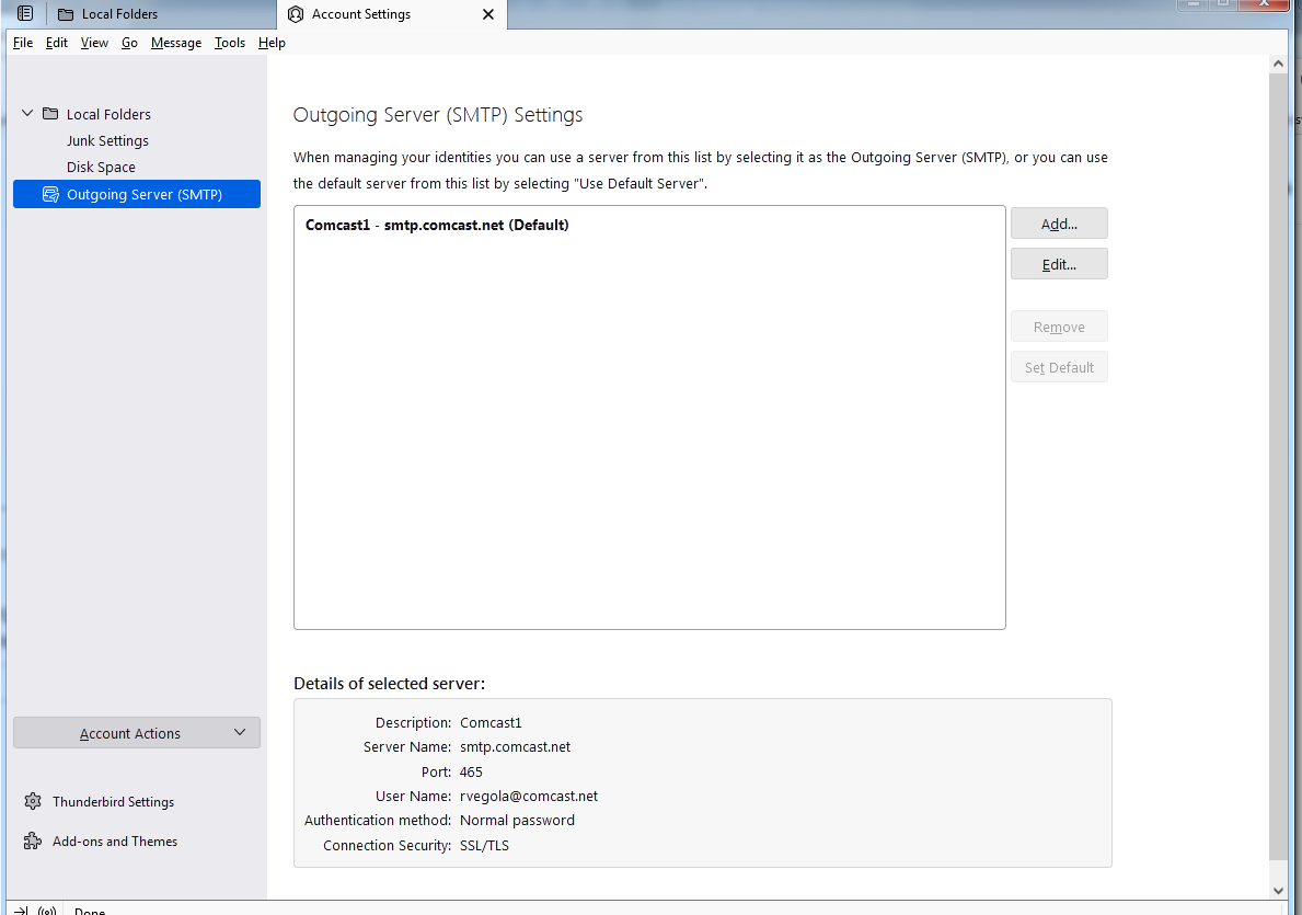 Below I posted a picture that shows that I only have the outgoing SMTP Comcast mail settings. I have no incoming settings being applied. I have tried several times to redo the Comcast setup by going to "FILE"---> "NEW"---> "EXISTING MAIL ACCOUNT" and go through the complete setup prompts. Thunderbird guides me through the setup procedures and recognizes my Comcast account and password, but does not give me an inbox with a Comcast folder with my email pop account. So I'm unable to create an email.