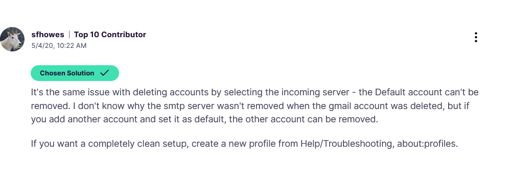 In the link below I was having the same problem as ng.newbie. I couldn't delete the outgoing Comcast smtp server. I had to do a completely clean setup and create a new profile.