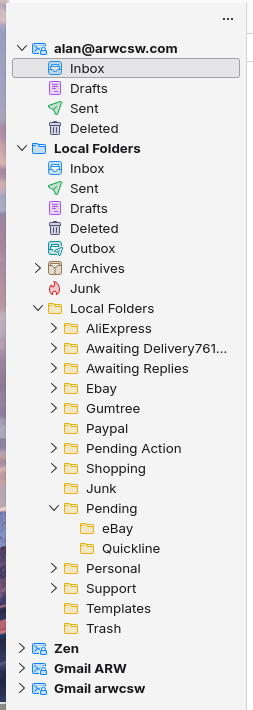 Thanks for the comments. I was aware of the things in your message but that is not really what I wanted to hear. I have used T/B for around 25 years at least and I store the profile in my docs folder so it is always backed up and available to my Windows computers. Whenever I have needed a re-install of Windows iI have used the "thunderbird -p" facility to reinstall the existing profile. This profile does just what I want. I have 4 email accounts only two of which receive emails regularly the other two I check manually every few weeks or so. Clicking on "Get mail" only checks the two main accounts and not the two others. So all my Windows computers are fine using the same profile. I do seem to remember there was a check box which allowed you to choose the default accounts to check but I can't find it now. This has arisen because I decided to learn a bit about Linux so I bought a second hand laptop to play around with. I installed T/B for Linux and tried to link it to my Windows profile, no success ???. So I then exported the Window version settings to a zip file from within T/B and used that to transfer the data/setup etc to the Linux laptop. That worked in a fashion with lots of things now displaying which are not on the Windows versions ie Account folders, Local folders etc, each with its sub-folders. I have set outgoing messages etc to store in Local folders but can not find how to set incoming mails to store in the Local Folders/Inbox. Whilst trying to find a solution to this I then noticed that the "Get Mail" button checked all 4 accounts which I appreciate is not a great problem, just a waste of time. I can not find anything about this in T/B help online or anywhere else I have looked. The two images show how the same profile is displayed in Windows and Linux and I prefer the Windows one as it is much simpler and more convenient to navigate. Regards Alan