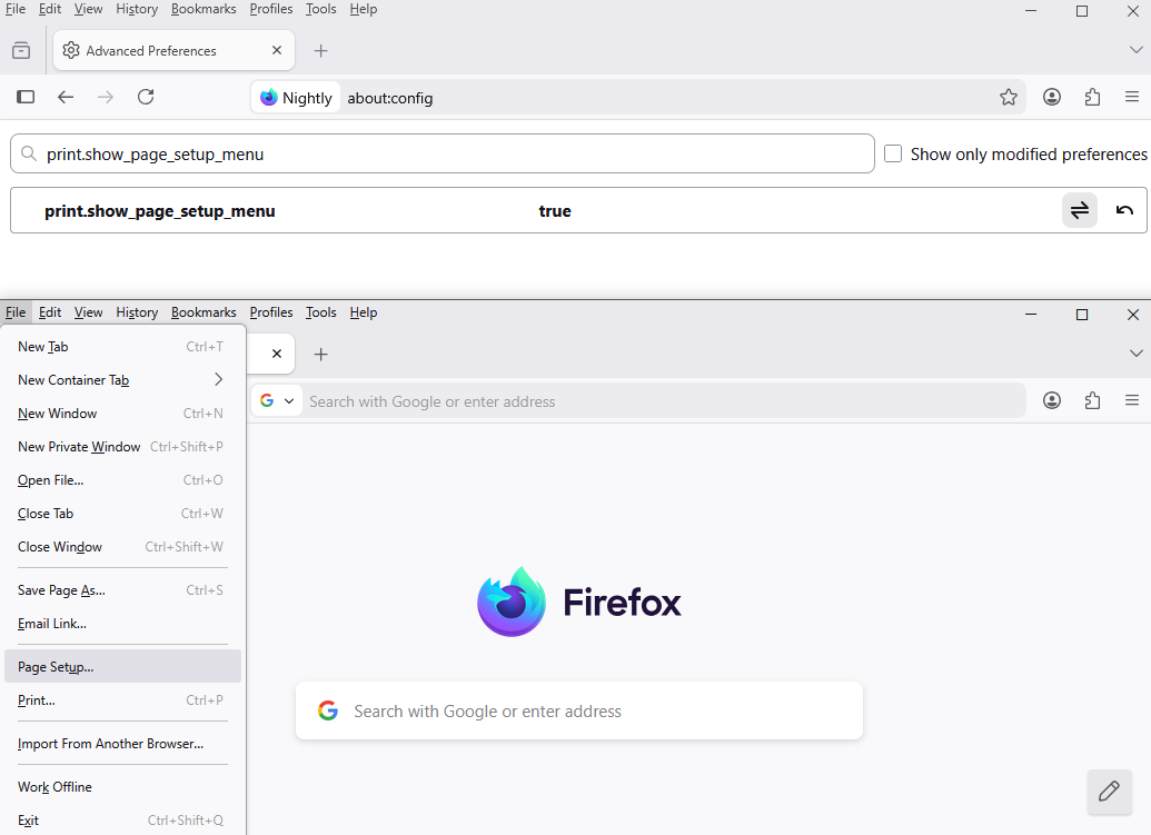 To complement, print.show_page_setup_menu, you can double-click on the preference to set the value to true
