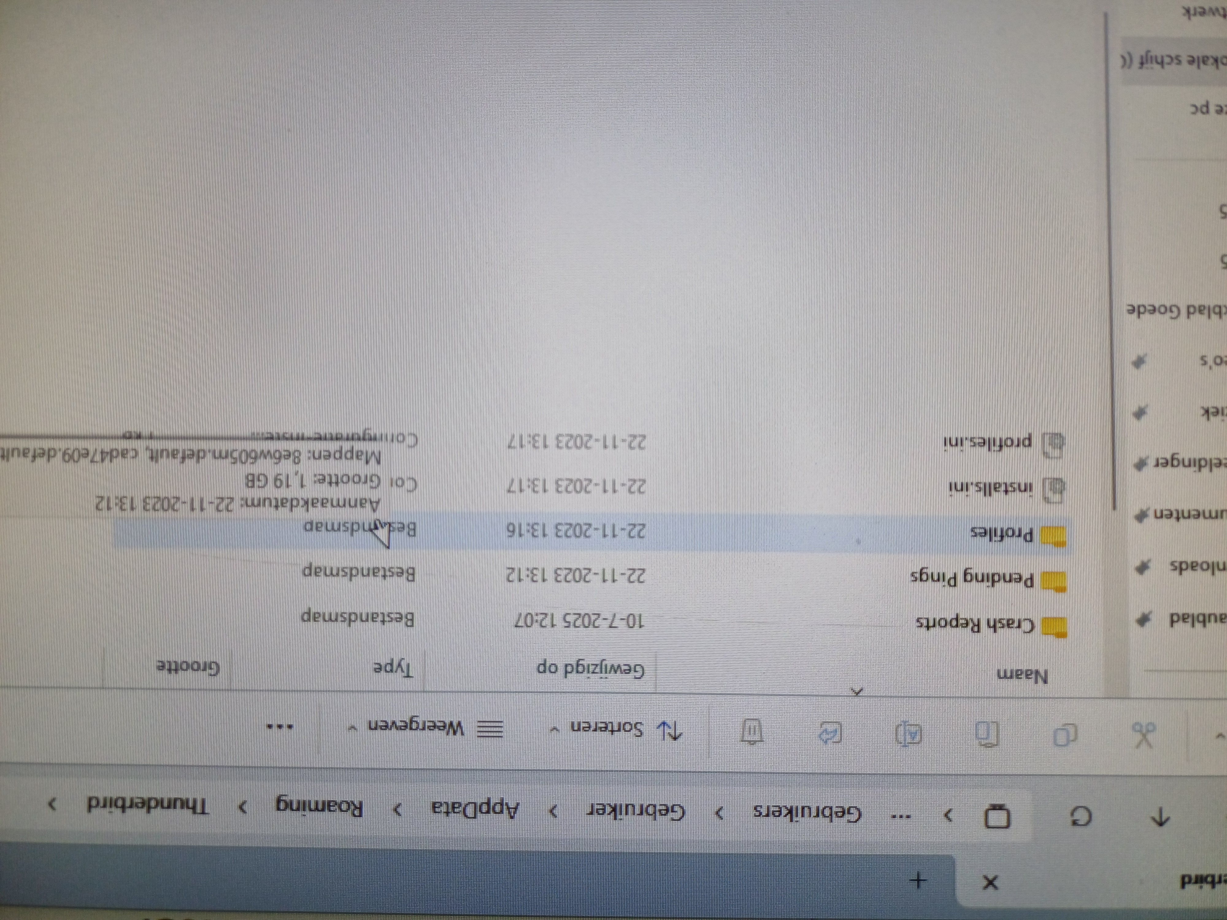 Ik heb na lang zoeken de map Appdata gevonden, maar er was me niet bekend dat het een verborgen map was. Dus eerst unhide gedaan. Zie de foto's van de map en de ini file. De ini file staat trouwens niet in de profile map. Moet ik de profiles.ini file nu een andere naam geven? Ik begrijp niet de term compatibility, die nu ineens genoemd wordt in jullie beantwoording.