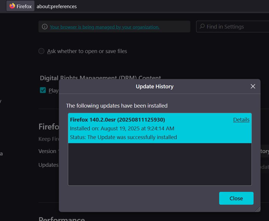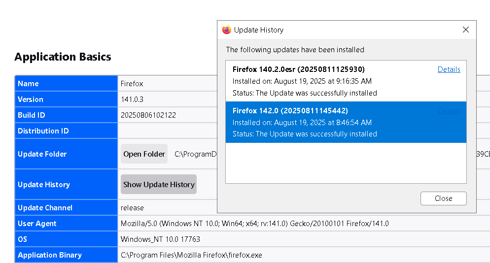 However, what's also interesting is that in the environment there are still a handful of devices that (this time around) - did NOT update to the release version and are still sitting on 140.2.0esr. Though, it's also not consistent if their update history has anything in it or not. For the screenshot 140.2.0Firefoxcap1 - this is what appears in the update history for a machine that just freshly had 140.2.0esr installed. However on another device still sitting on 140.2.0, this window is blank and shows no update history at all.
