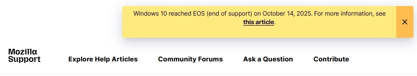 The warning message from Mozilla on this page telling me "Windows 10" is no longer supported is misleading and over the top, doncha think?.