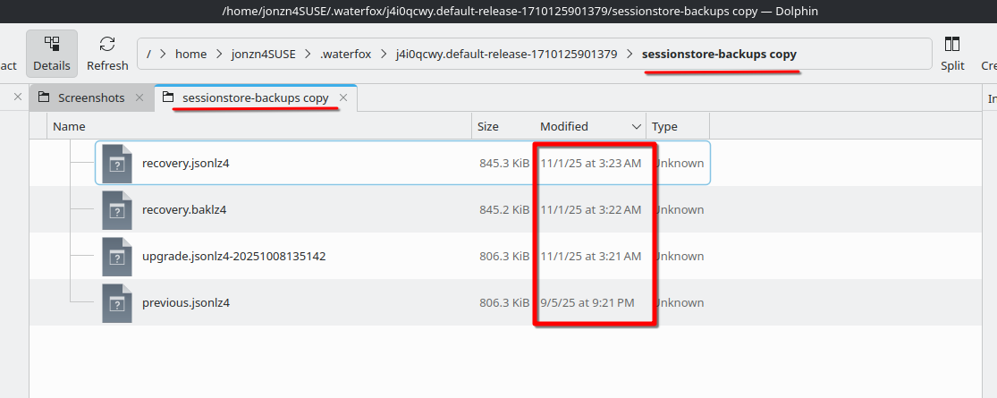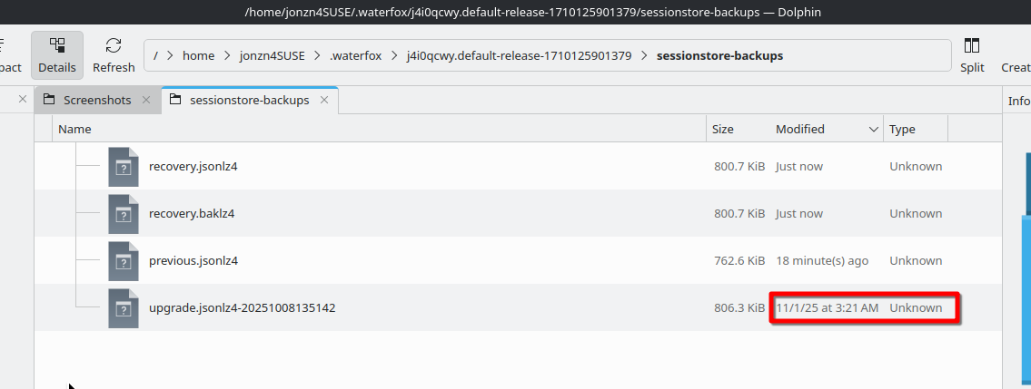 - sessionstore.jsonlz4 and previous.jsonlz4 both contain the single tab we talked about before (plus closed windows I don't care about)