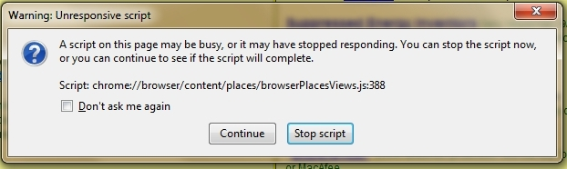 This code is all I know: chrome://browser/content/places/browserPlacesViews.js:265 The system locks for :30 seconds before showing this to me. When I select "stop script" it returns to normal and allows a single URL to be bookmarked. But trying to bookmark anything again goes through the same frustrating cycle. What is "js.265" ? That would be my only guess. I mis-typed the code yesterday. I corrected it here and am adding a screen shot of it now. Clarification, it is only Firefox that locks up, other functions on the computer work, so I was able to obtain a screen shot for you.
