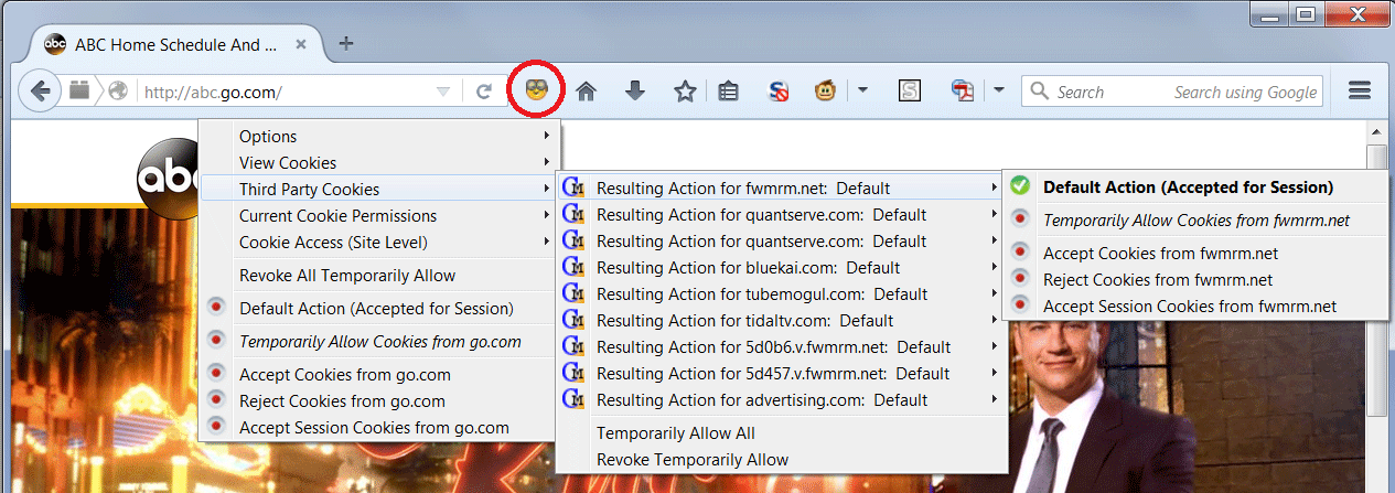 The Cookie Monster button on the toolbar allows you to see permissions for first party and third party cookies and to change them.