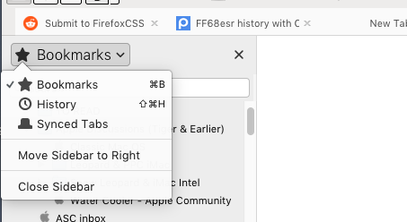 Wondering what edits or additions I can make to the above CSS to allow the FF68 bookmarks sidebar to have the same appearance. (Or possibly needs completely re-written CSS?) Since it works perfectly for both bookmarks and history in Waterfox, could it be the issue is with how the current FF CSS doesn't take into account the way the bookmarks sidebar is selected only from a dropdown? https://i.postimg.cc/j50Jqq9C/FF-sidebar-selection-dropdown.png