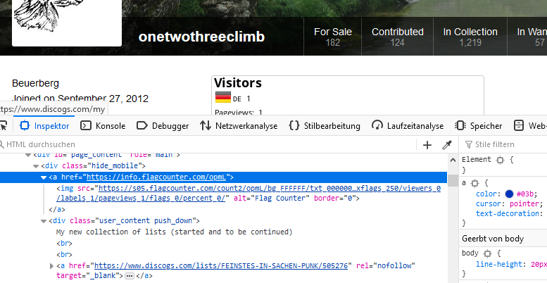 I'm trying to insert a flagcounter from flagcounter.com in the sourcecode of my discogs-profile site. As I am no developer i'm not sure why the flagcounter doesn't stay on the site (after inserting the code, first it gets displayed). When I quit the page and reload it, it's gone