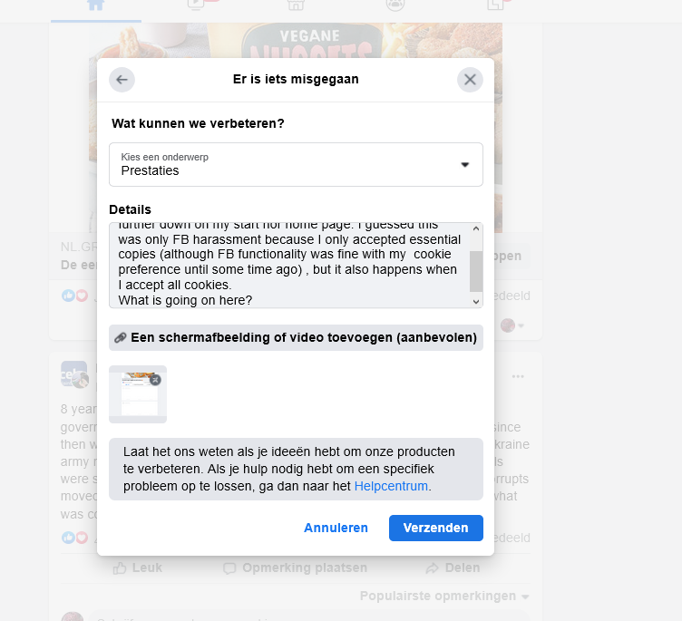 Also , with your own FF browser I even cannot send feedback (also see other attachement) Usuing another webbrowser (Chrome) for Facebook worked perfect. What is going on here?