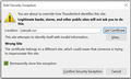 I have TB installed on an older laptop, working well. I downloaded and installed TB on a new Windows laptop. When the auto setup runs to set up the first email account, the server settings are identified and "Account successfully created" is shown. Then Add Security Exception dialog pops up, preloaded with talktalk.net in the Location box. A message reads "Wong site - The certificate belongs to a different site, which could mean that someone is trying to impersonate this site." "permanently store this exception" box is ticked. The "Get Certificate" button does nothing. I am invited to "Confirm security exception." It sounds wrong - what am I supposed to do?