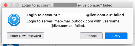 Have used Thunderbirds since converting to Mac in 2013. Now Thunderbirds will not let me login to my @live.com.au account. I get the attached message each time I try to login. However I can receive mail on Messages using my iPad but that is IMAP configured and the Laptop Pro is POP configured. I can also login to my gmail accounts OK on Thunderbirds Please be patient with me as being in my 80's my IT ability is limited. Regards Deryck