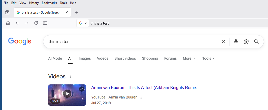 Attached is a screenshot of what I now see. Note what's in the address bar -- my original search string. Previously, it would have been something like "https://www.google.com/search?q=this+is+a+test&sca_esv=[ ...]"