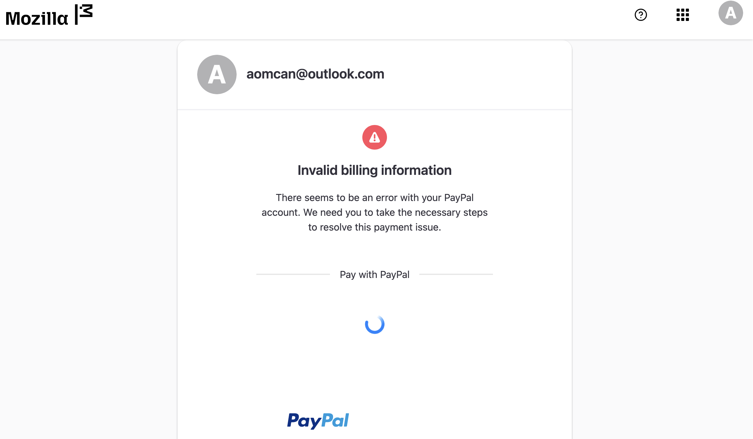 I have an issue changing my billing information for Firefox Relay Premium. When I click on "Manage payments" I always get to a web page stating "Invalid billing information". See also screenshot attached. The arrow keeps turning and I cannot select anything on this web page to change my billing method.