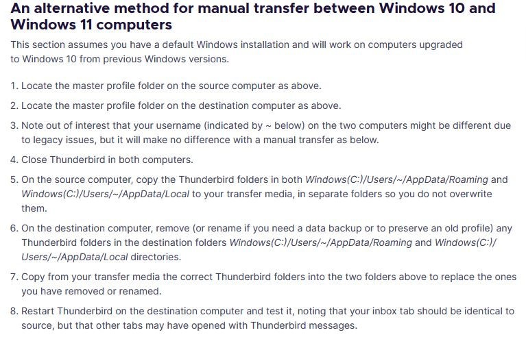 Locate the master profile folder on the source computer as above. Locate the master profile folder on the destination computer as above. Note out of interest that your username (indicated by ~ below) on the two computers might be different due to legacy issues, but it will make no difference with a manual transfer as below. Close Thunderbird in both computers. On the source computer, copy the Thunderbird folders in both Windows(C:)/Users/~/AppData/Roaming and Windows(C:)/Users/~/AppData/Local to your transfer media, in separate folders so you do not overwrite them. On the destination computer, remove (or rename if you need a data backup or to preserve an old profile) any Thunderbird folders in the destination folders Windows(C:)/Users/~/AppData/Roaming and Windows(C:)/Users/~/AppData/Local directories. Copy from your transfer media the correct Thunderbird folders into the two folders above to replace the ones you have removed or renamed. Restart Thunderbird on the destination computer and test it, noting that your inbox tab should be identical to source, but that other tabs may have opened with Thunderbird messages.