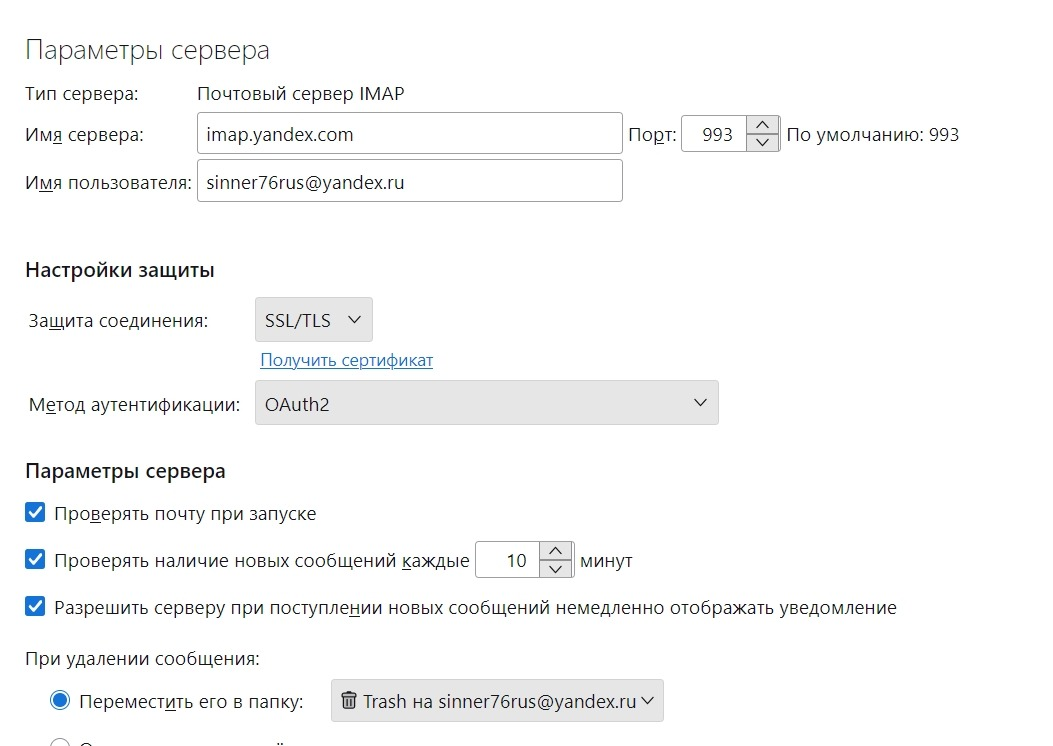 Configuring server settings for Yandex Mail
