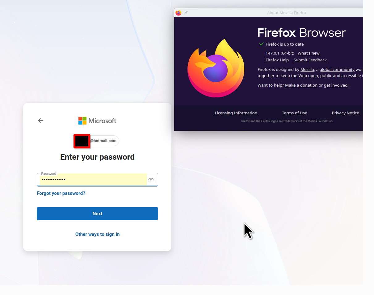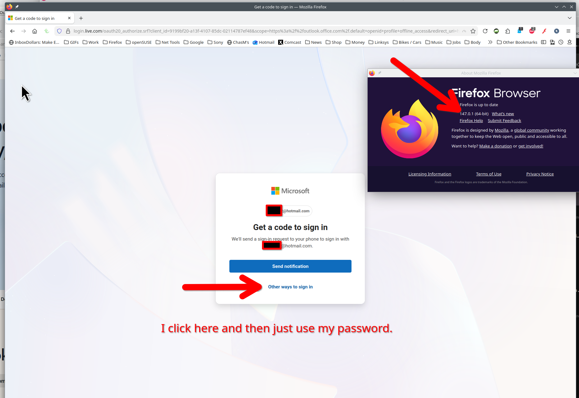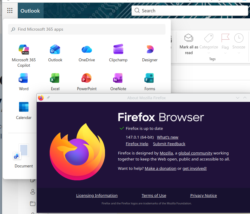 Since latest upgrade (1/16/2026) I cannot log in to Outlook email. This is specific to Firefox 147.0.1 (Chrome and Pop Peeper logins to Outlook work fine). I tried clearing cache, updating, restarting, rebooting, trouble-shooting mode, private window etc. to no avail. I get 400 error from Outlook.