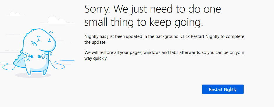 Come on, I am getting tired. Instead of doing a couple of last things before bed I am writing a support request to learn how to opt out of this stupidity. I want to use the machine when it suits me and restart my browser when it suits me, it might not be until tomorrow. But if this "feature" get to mainstream as is, I am out of here. Firefox will be down another user completely disappointed that user choice is gone from yet another project.