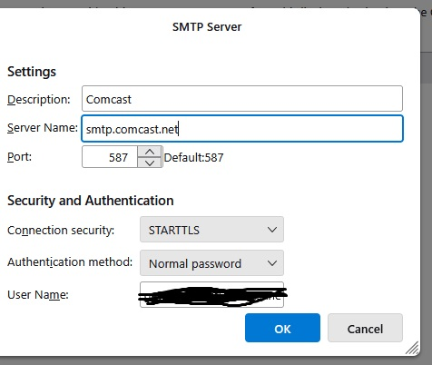 Thunderbird is able to receive email but unable to send email. I have confirmed with my provider that I can send email through their web portal. Mail provider is Comcast. ISP is T-Mobile Virus is Bitdefender build 27.0.55.279 Windows 11 Thunderbird version 144.0.1 64bit SMTP settings attached