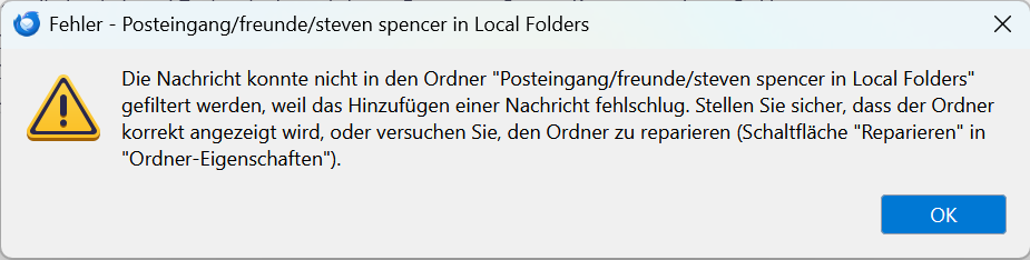 Then I created a new folder as a child to the inbox folder, and a new folder inside of this folder to hold emails from FAZ. I defined a new filter rule, as the old ones were removed. Worked for a few emails, and, voila, the message pop-up came again, telling me there are problems moving the email over to the (new) target folder.