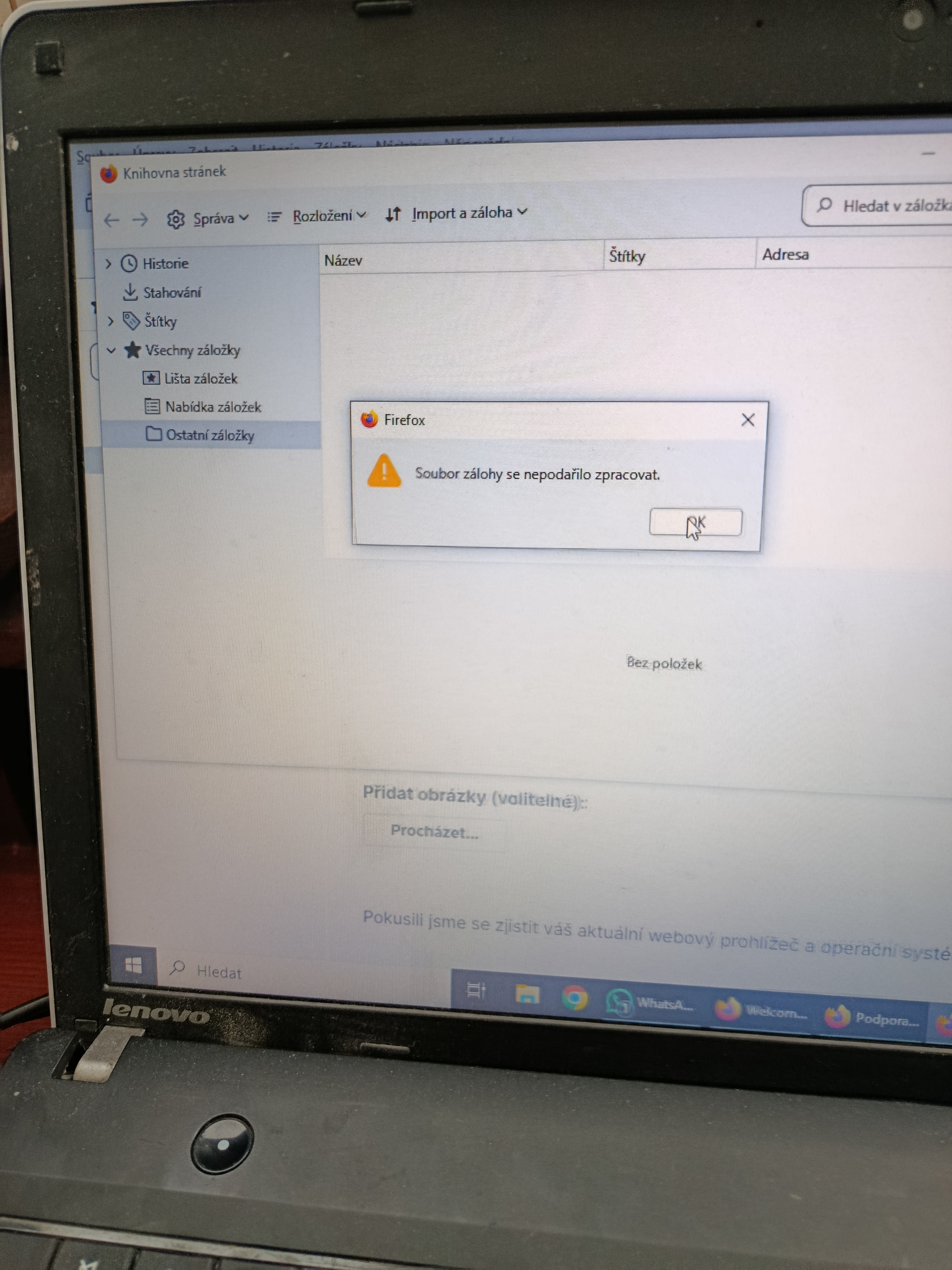 Ze dne na den mi zmizely na ntb záložky ve Firefoxu. Při snaze o obnovu z předchozích záloh vyskočí hláška: soubor záložek se nepodařilo zpracovat. Zálohoval jsem si tedy záložky na PC a přenesl soubor .json do ntb. Píše mi to stejnou hlášku.