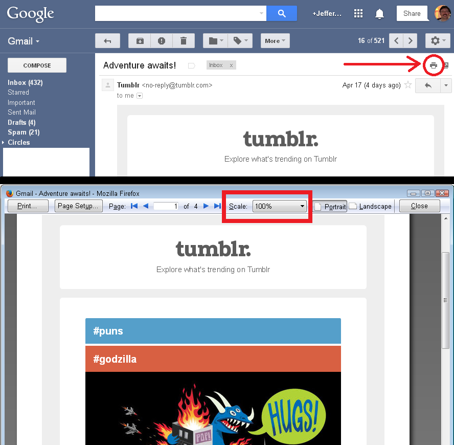 How do I increase the font size from its current tiny size when printing gmails in Firefox