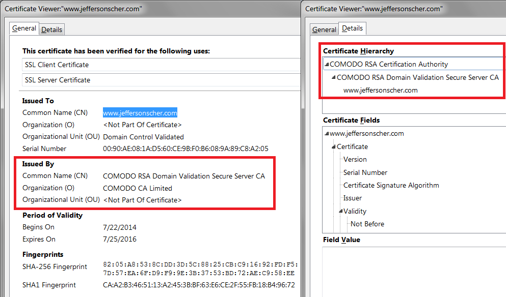 This should pop up the Certificate Viewer. Look at the "Issued by" section, and on the Details tab, the Certificate Hierarchy. What do you see there? I have attached a screen shot for comparison.