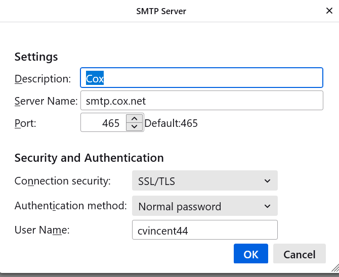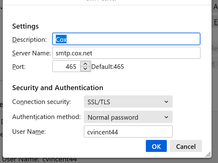 Starting a few days ago when I try to send an email with Bcc from my desktop I get the error message: "The message could not be sent using Outgoing server (SMTP) smtp.cox.net for an unknown reason. Please verify that your Outgoing server (SMTP) settings are correct and try again." TB is up to date and I'm using ver 91.2.1. Even when I open TB in Troubleshooting Mode with all Add ons disabled the same thing happens. I checked my Outgoing Server settings and they are the same as always. See attached. I changed my password but still no difference. I'm using Windows 10 Home edition and Firefox is my browser. Please help.