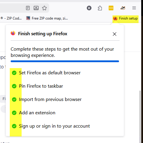 Why does Firefox still show "Finish Setup" in the upper right corner when I have already finished the setup?