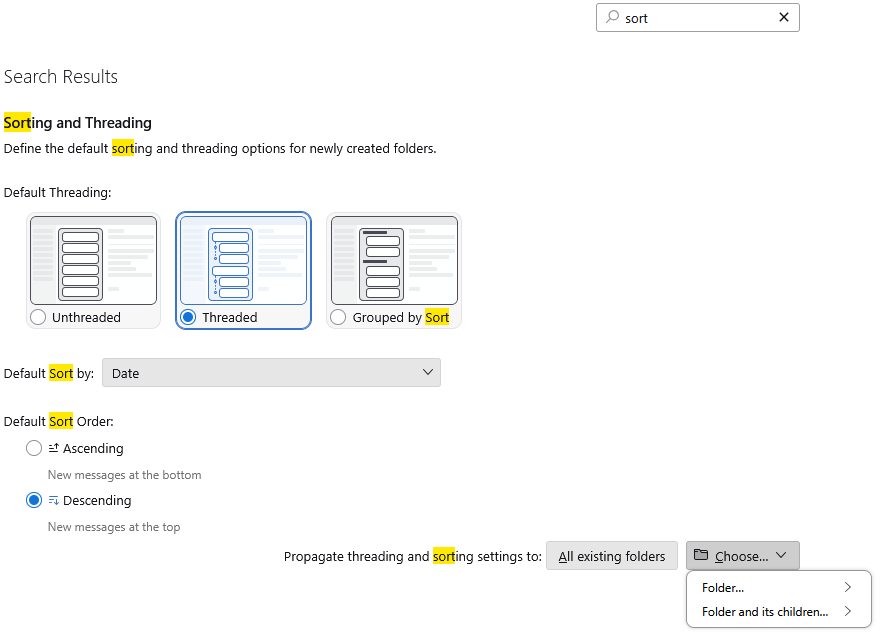 I'm sure I did set descending in settings but didn't see "apply to all folders / chose folder". It's actually only one email account where messages are ascending. They still are and "apply to all folders" does not change it now. But that might be because they were sent and received before I set the settings to descending... ?